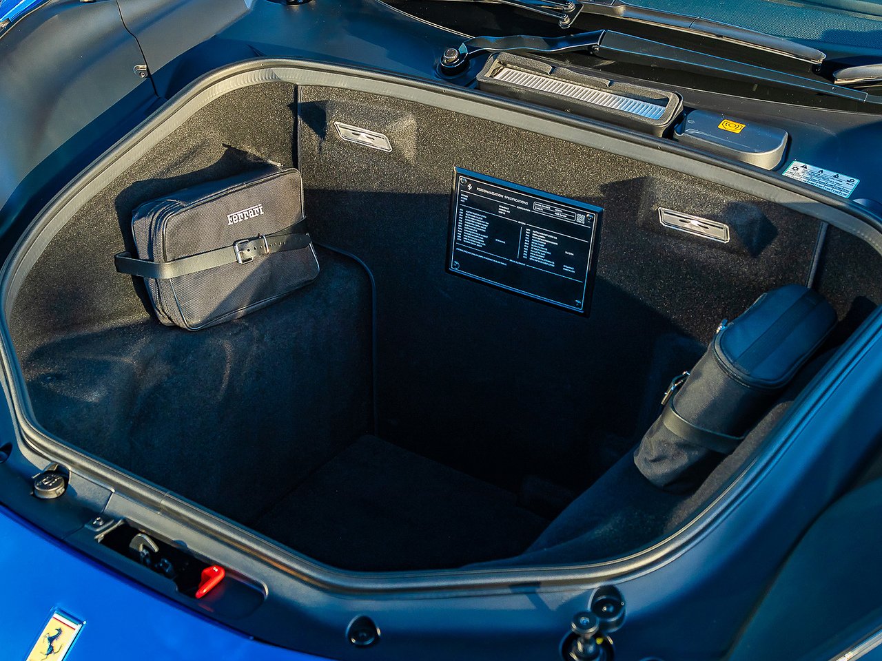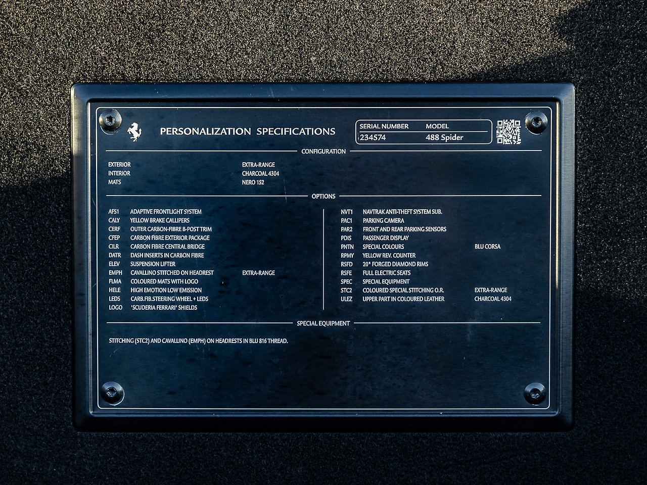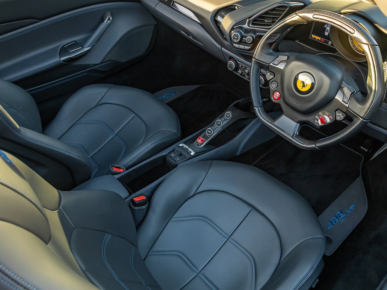 20” Forged Diamond Rims | Adaptive Frontlight System | Yellow Brake Calipers | Outer Carbon Fibre B Post Trim | Carbon Fibre Central Bridge | Dash Inserts in Carbon Fibre | Suspension Lifter | Cavallino Stitched On Headrest in Blu 816 Thread | Coloured Mats with Logo | Carbon Fibre Steering Wheel and LEDs | Scuderia Ferrari Shields | Parking Camera | Front and Rear Parking Sensors | Passenger Display | Yellow Rev Counter | Full Electric Seats | Coloured Special Stitching in Blu | Upper Part Of Dashboard in Coloured Leather