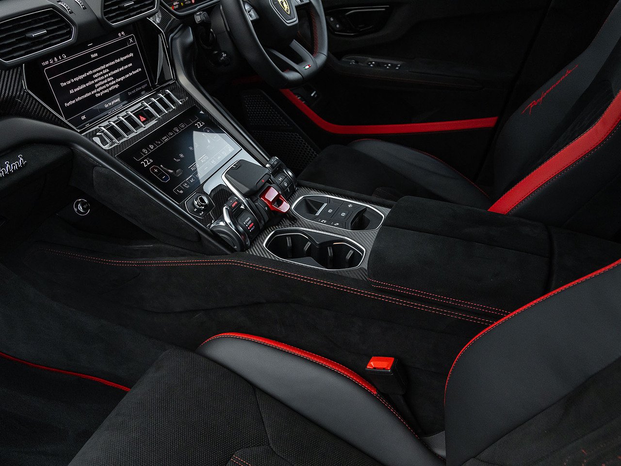 23" Pelope Diamond Finished and Shiny Black Rims with Titanium Wheel Bolts | Gloss Carbon Fibre Roof (£6,242) | Gloss Carbon Fibre Bonnet (£5,064) | Rear Spoiler Lip in Gloss Carbon Fibre | Gloss Carbon Fibre Wheel Arches | Carbon Fibre Interior Package | Advanced 3D Bang & Olufsen Sound System | Red Brake Calipers | Heated and Heat Reflective Windscreen | Acoustic Privacy Glass and Heat Insulated | Full Electric Front Seats with Ventilation and Massage Function | Ambient Lighting Package | Sports Steering Wheel in Full Leather with Dark Chrome Bezel and Red Marker - Heated | Optional Stitching To Steering Wheel in Rosso Alala | Floor Mats with Leather Piping and Double Stitching | Garage Door Opener | Wiper Blades with Integrated Nozzles
